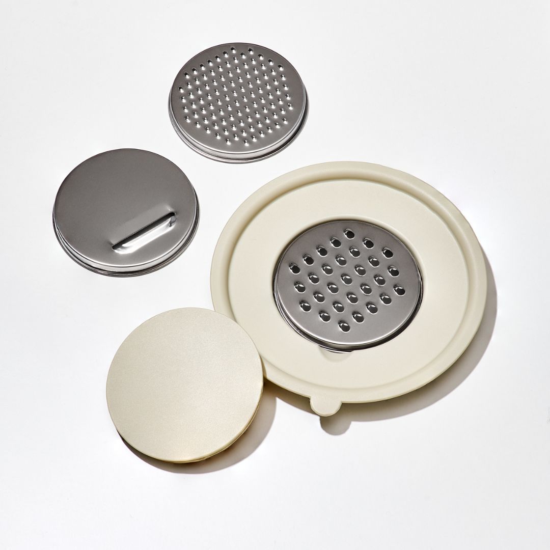 Das enthaltene Reiben-Set mit drei austauschbaren Edelstahl-Reiben wird einfach auf die Schüssel aufgesetzt und ermöglicht sauberes Arbeiten ohne zusätzliche Gefäße: