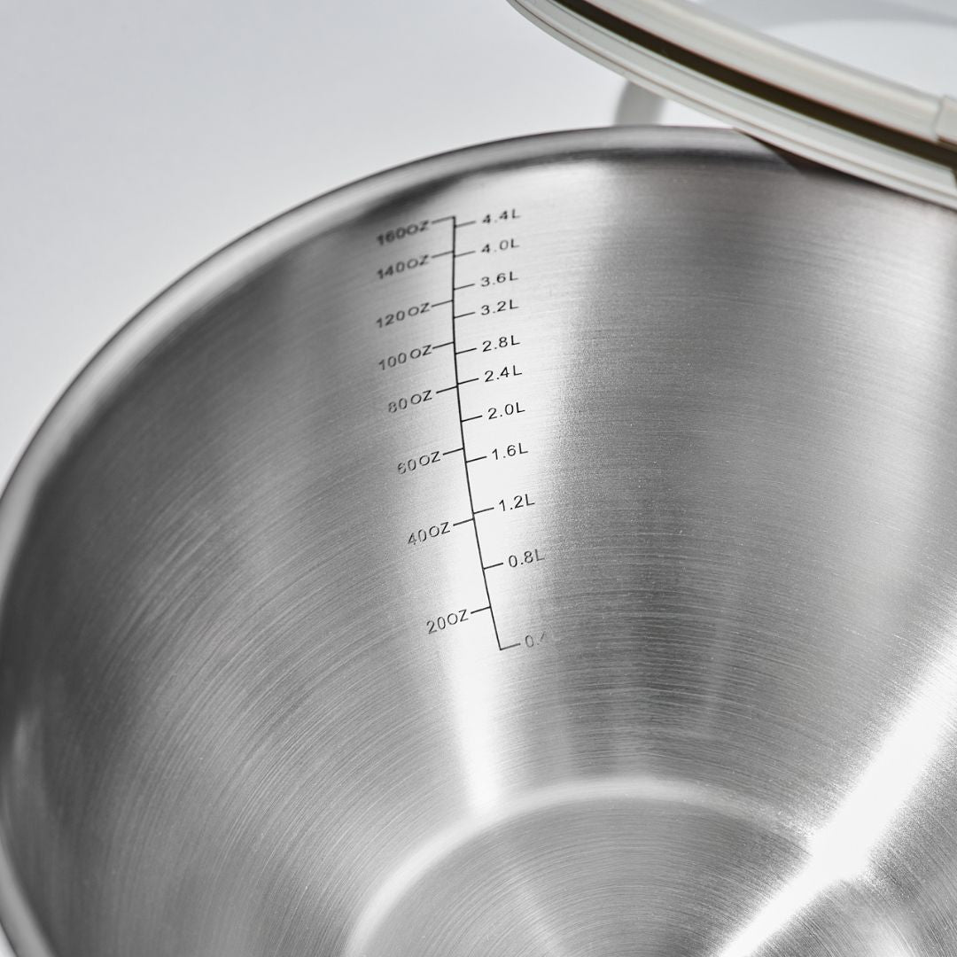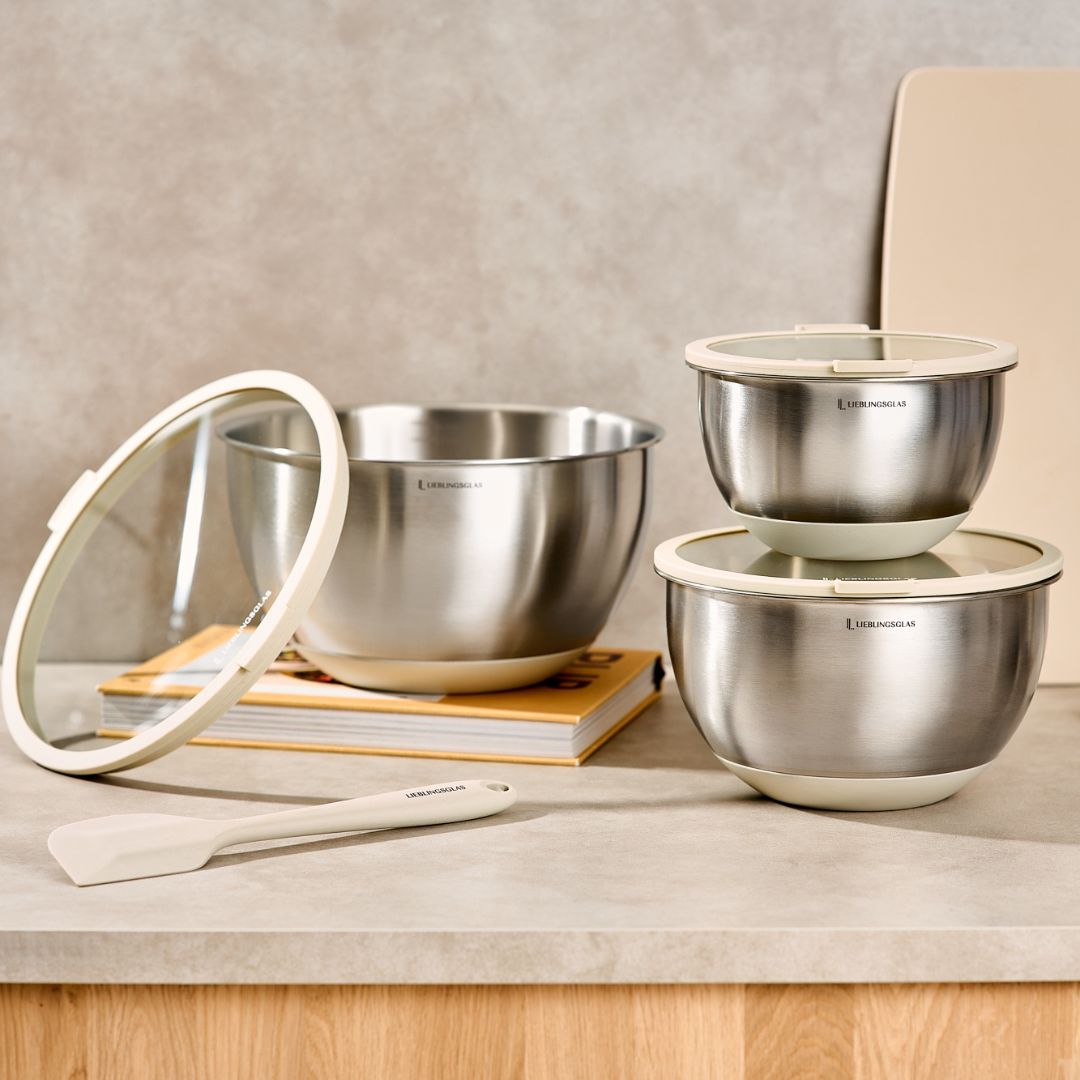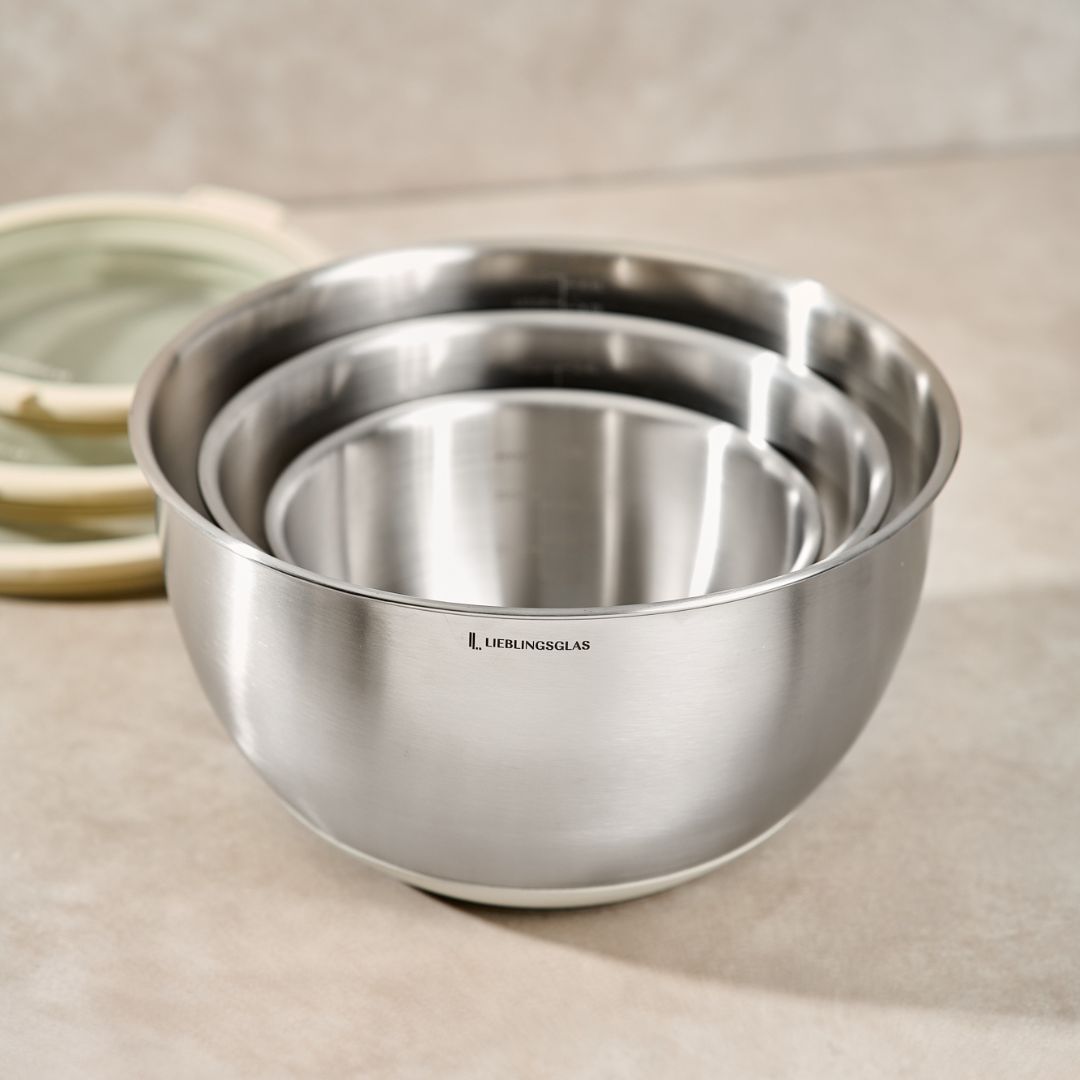 Jede Schüssel besteht aus gebürstetem Edelstahl und ist mit einem rutschfesten Silikonboden ausgestattet, der für sicheren Stand auf der Arbeitsfläche sorgt. Die integrierte Skala ermöglicht präzises Abmessen direkt in der Schüssel, während die passgenauen Glasdeckel mit Silikonrand deine Lebensmittel länger frisch halten – ideal zum Vorbereiten, Servieren oder Mitnehmen.