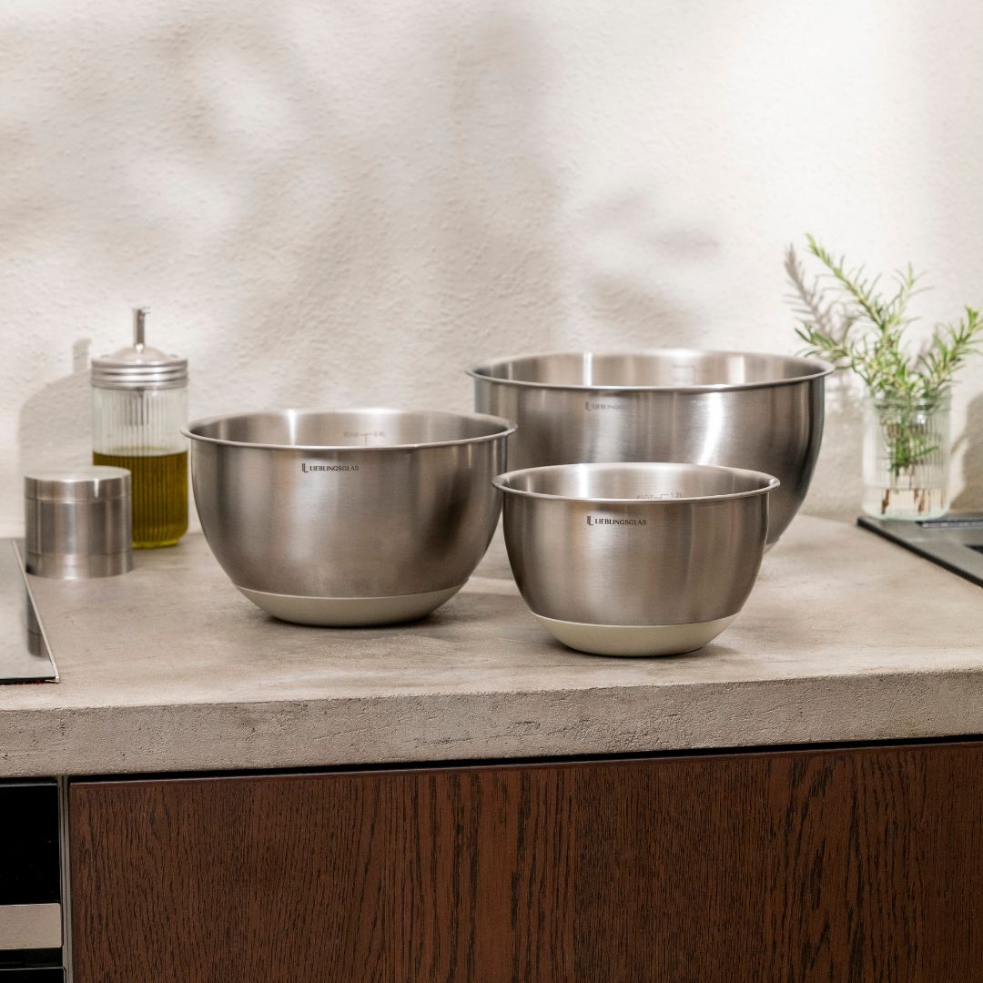 Nach dem Gebrauch lassen sich alle drei Schüsseln ineinander stapeln und platzsparend verstauen. Pflegeleicht, funktional und vielseitig – ein perfekt abgestimmtes Set für jede Küche.