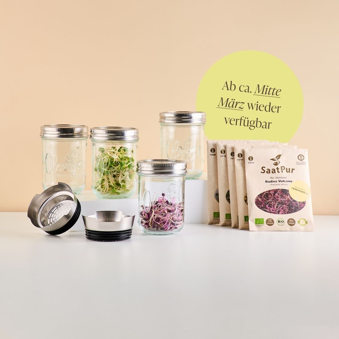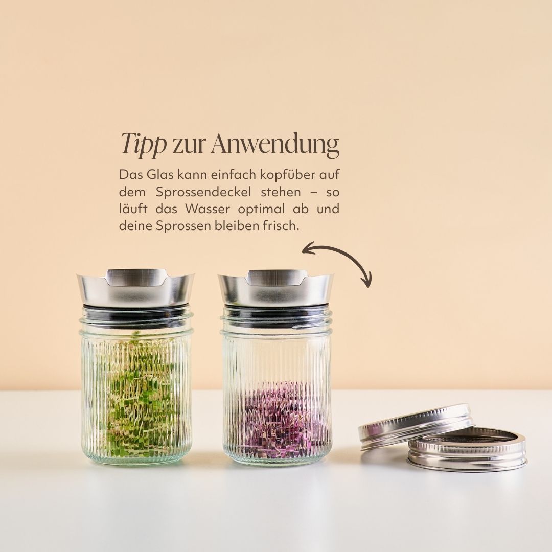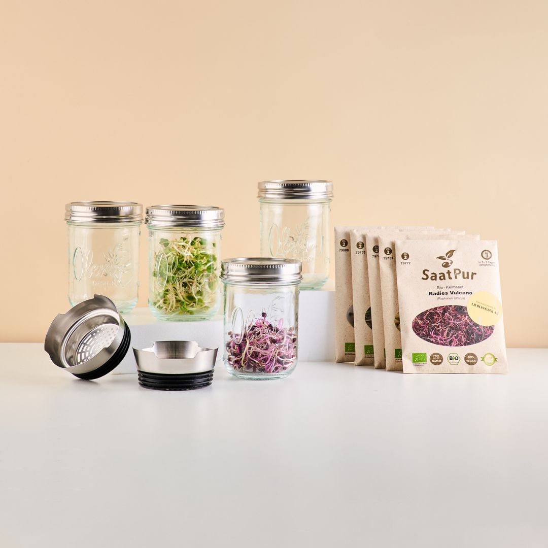 Mit unserem Sprossen Starter Set kannst du ganz einfach gesunde, leckere Sprossen direkt im Glas ziehen. Das Set enthält alles, was du brauchst: