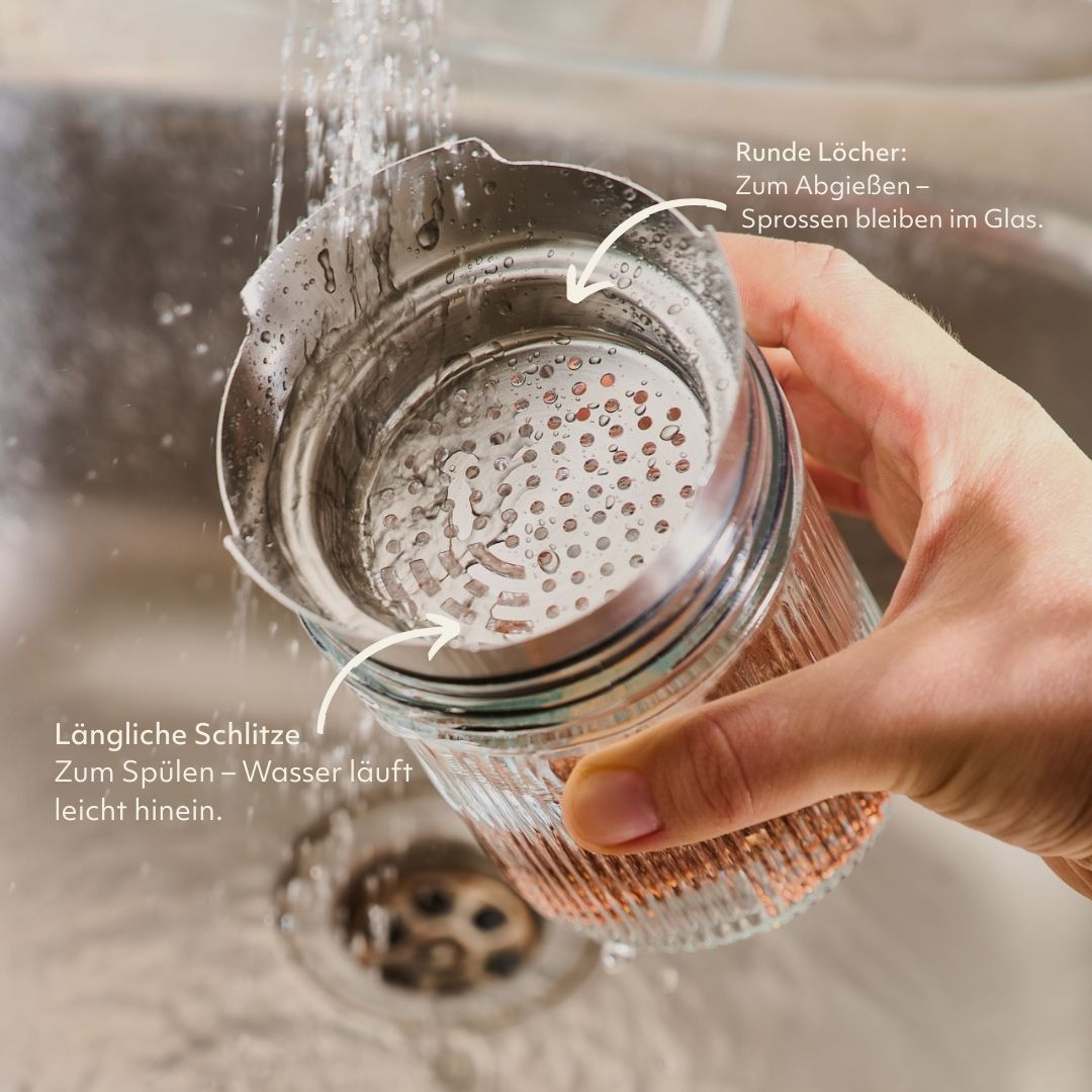 Dank der clever integrierten Füßchen kannst du das Glas nach dem Spülen einfach über Kopf abstellen. So läuft überschüssiges Wasser optimal ab, Staunässe wird vermieden und deine Keimsaat entwickelt sich zuverlässig zu knackigen, frischen Sprossen. Spülmaschinengeeignet und robust, begleitet dich der Deckel über viele Jahre.