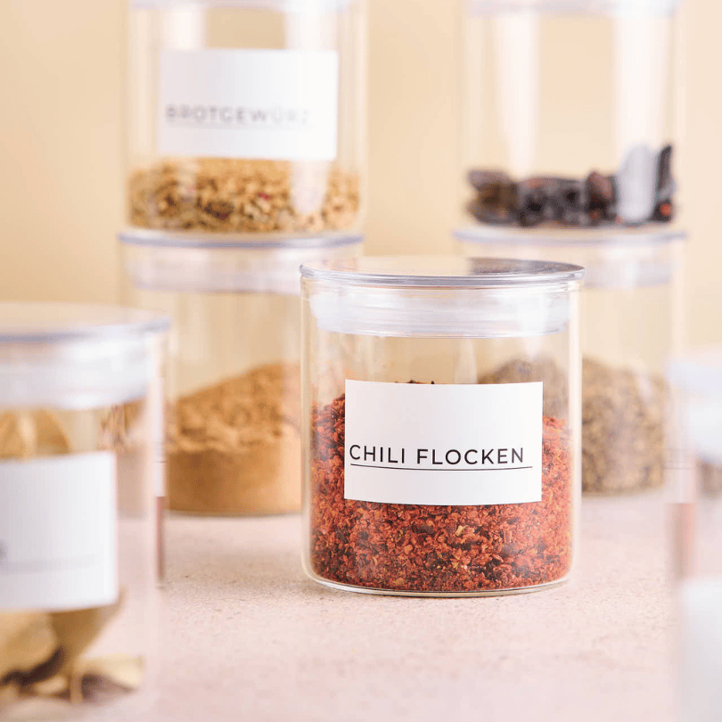 Ordnung trifft Design: 20 runde Mini Jars aus Borosilikatglas und Etiketten für noch mehr Durchblick.