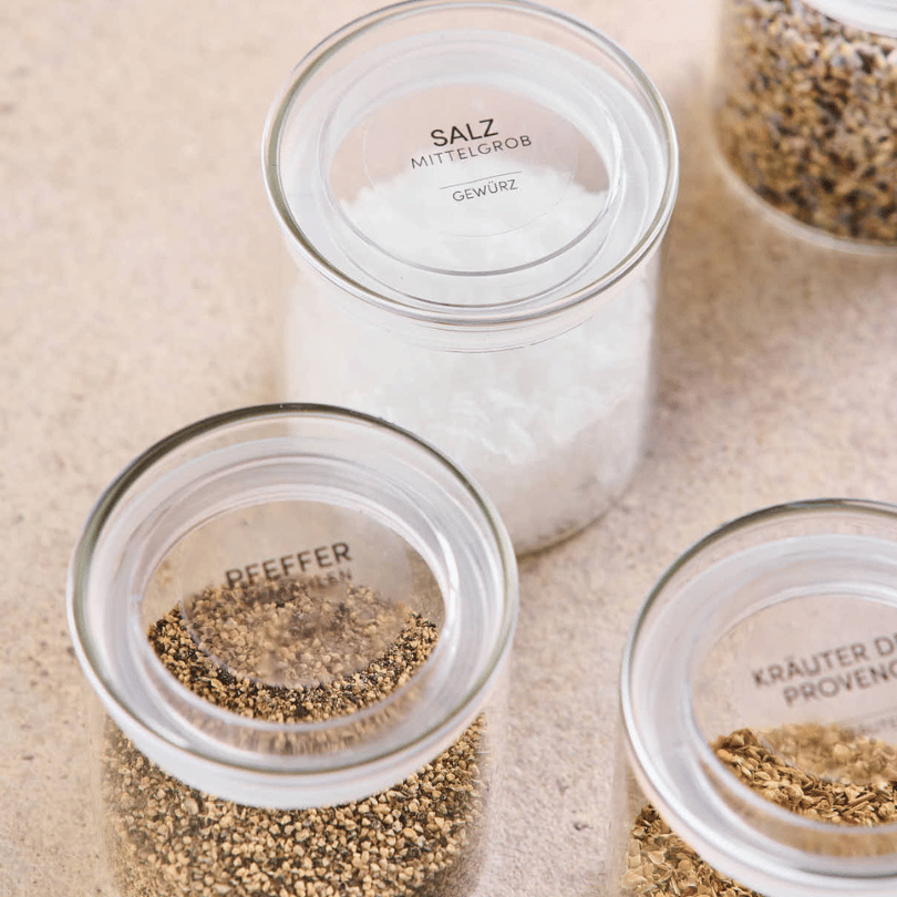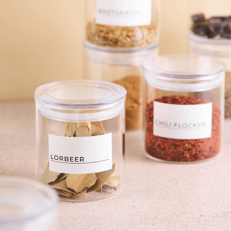 Die Labels haften zuverlässig, auch nach Spülmaschinen-Gängen. Ob auf der Gewürztreppe, in der Schublade oder offen im Regal – deine Gewürze sind hygienisch, übersichtlich und stilvoll präsentiert.