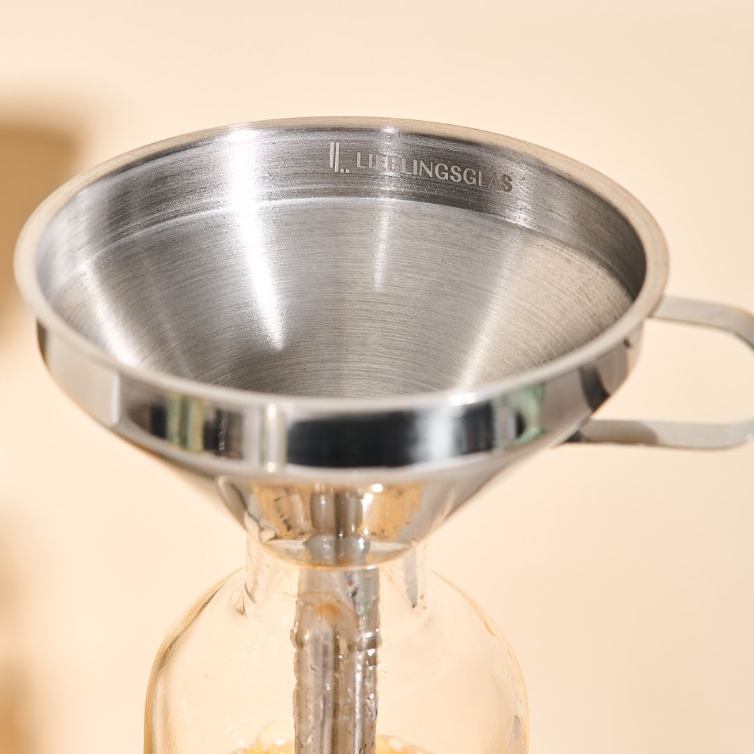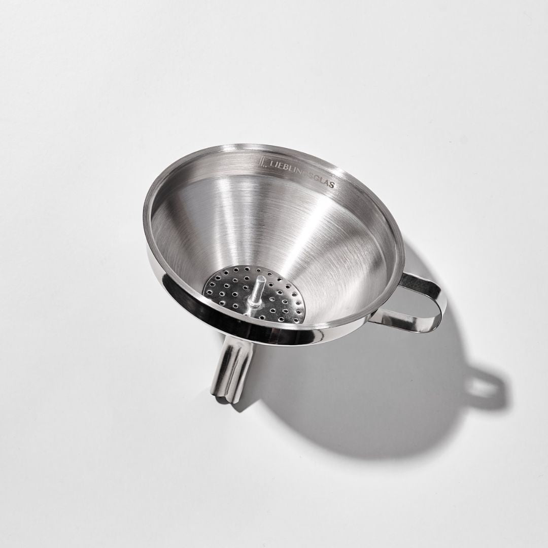 Unser Flaschentrichter aus hochwertigem Edelstahl macht das Umfüllen einfach, sauber und präzise. Durch seine schmale Form passt er perfekt in unsere Glasflaschen – für ein tropffreies, sicheres Arbeiten ohne Kleckern.