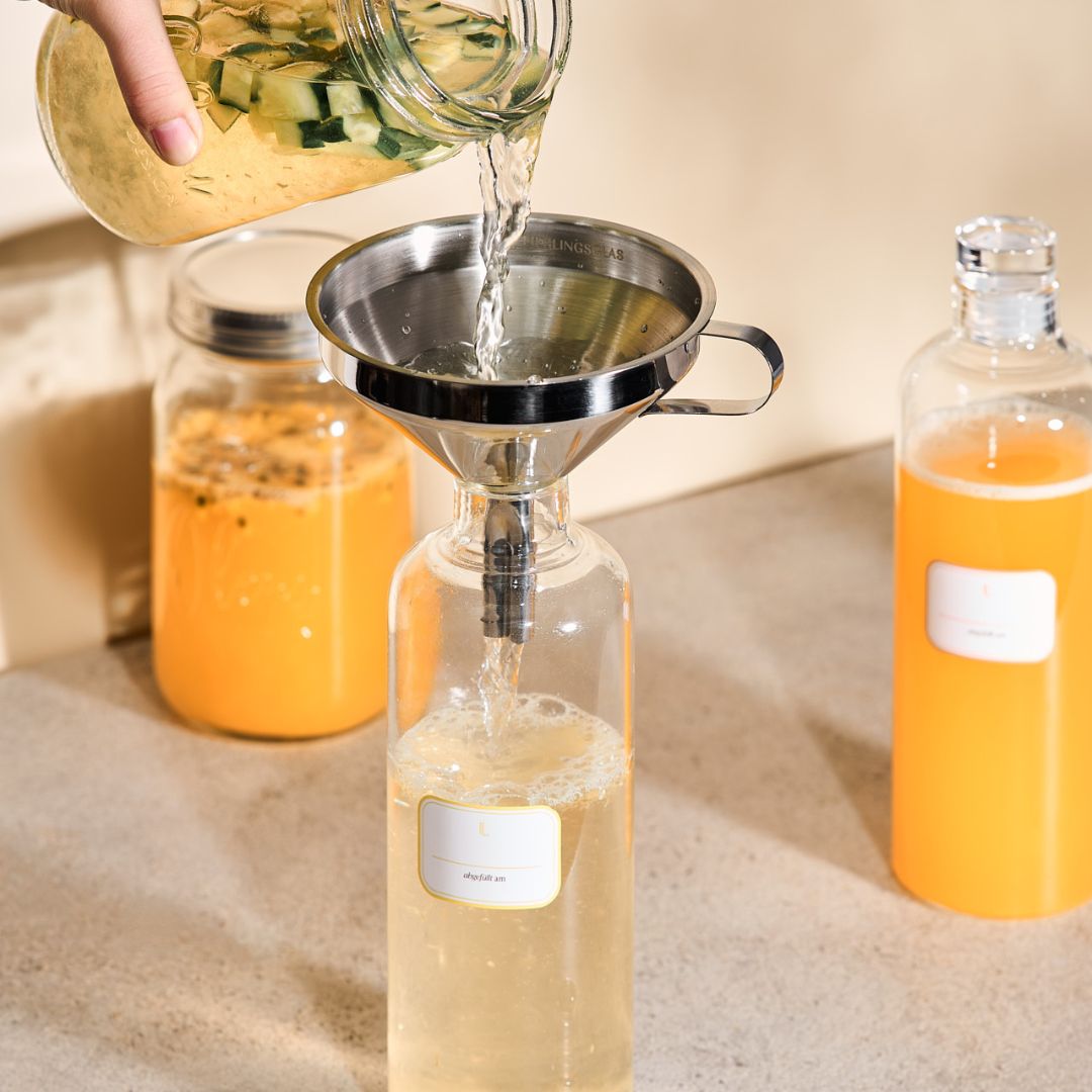 Das herausnehmbare Sieb filtert zuverlässig Kefirkristalle, Fruchtstücke oder Kräuter heraus und sorgt für klare, gleichmäßig abgefüllte Getränke. So wird das Abfüllen von Wasserkefir, Kombucha oder aromatisierten Ölen zum kleinen Küchenritual mit Leichtigkeit.